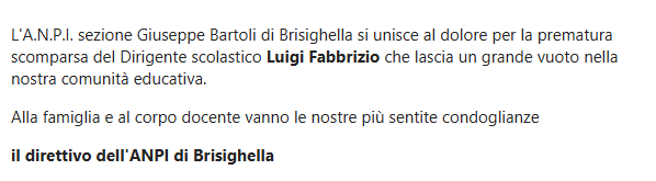 22-12-2025 | IST. TECN. COM. "G. GINANNI" Cordoglio della comunità scolastica dell’ITE GINANNI per la scomparsa del prof. Luigi Fabbrizio, DS I.C. Brisighella dal 22-12-2025 al 31-12-2025 Cordoglioscomparsa-prof.LuigiFabbrizio.pdf (361.95 KB) ComunicatoStampa.pdf (67.35 KB) |